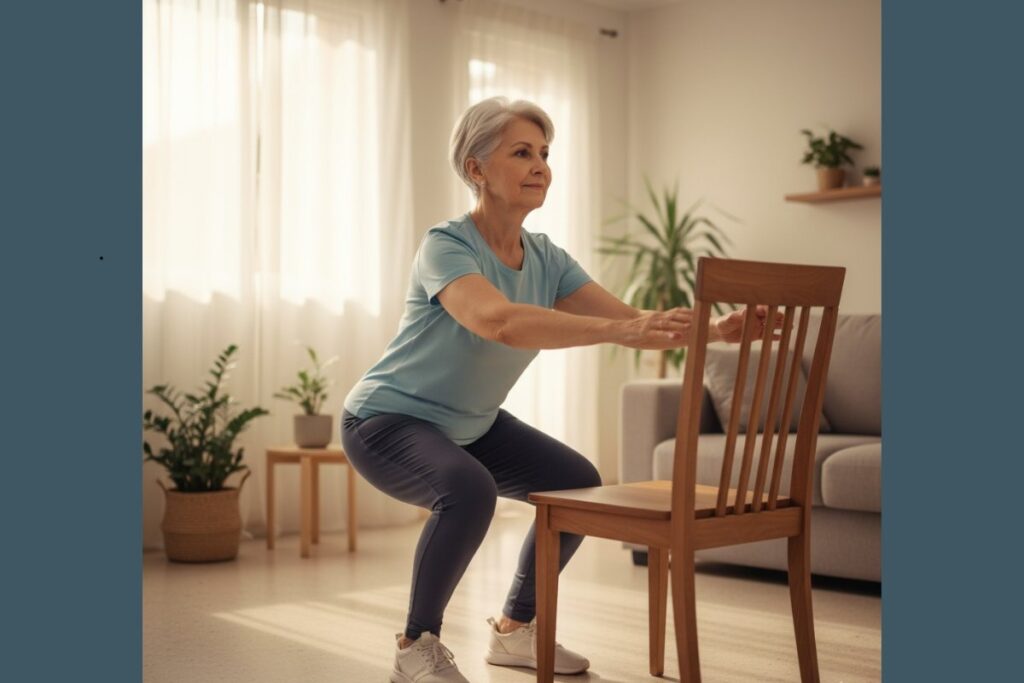 Sente-se e levante-se com calma, repetindo o movimento sem pressa. Caso seja difícil, use as mãos para apoiar. É um dos exercícios para idosos mais completos, pois fortalece pernas e glúteos ao mesmo tempo.