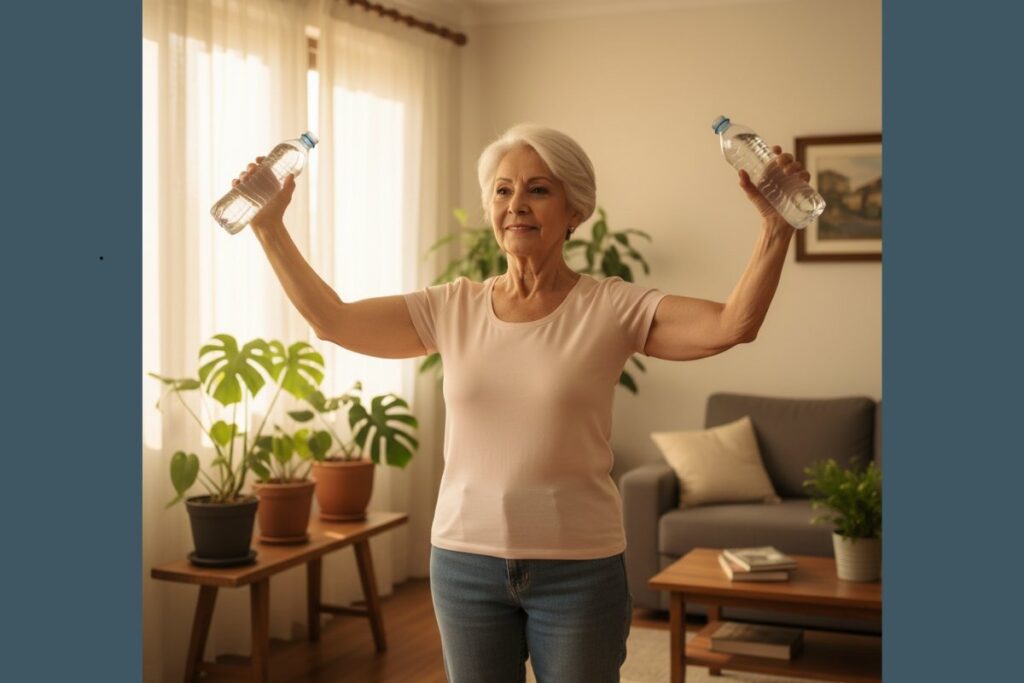 Uma cadeira estável, uma parede livre e uma garrafa de água já são suficientes para a maioria dos exercícios para idosos.