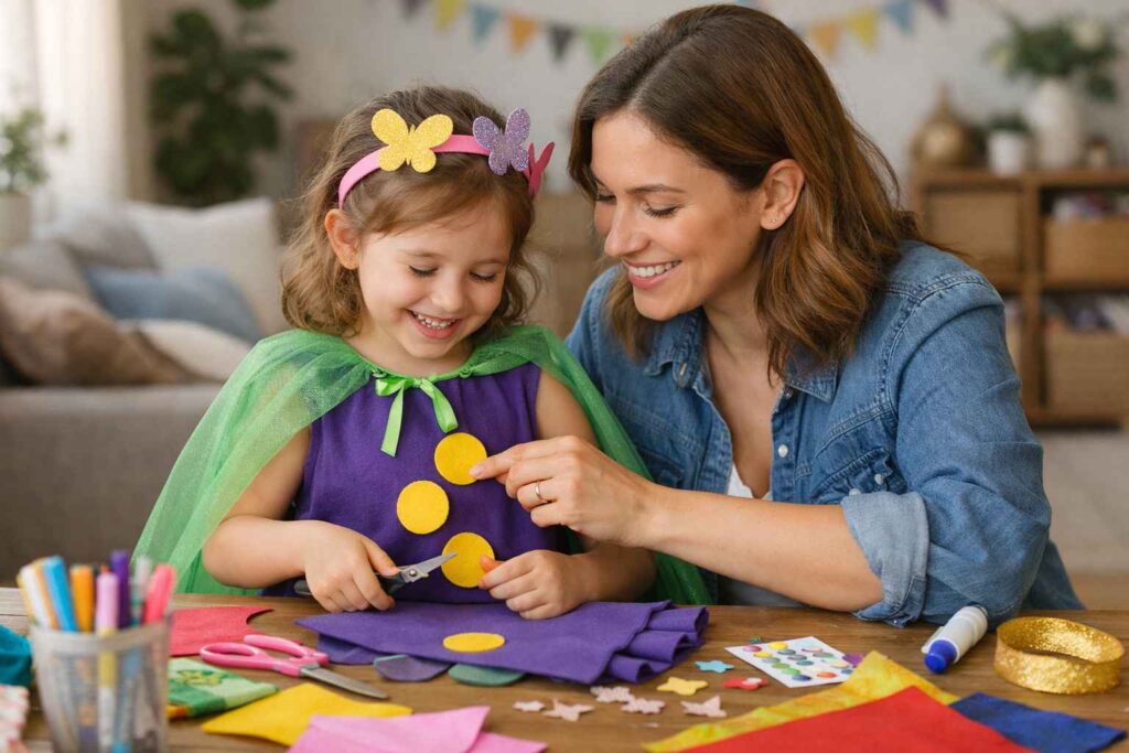 Com esses materiais, a fantasia de Carnaval infantil fácil de fazer se adapta a diferentes temas, sem exigir habilidades avançadas.