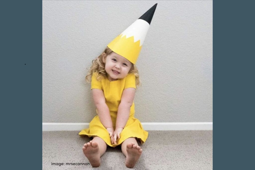 Usando uma roupa amarela e um chapéu de cartolina, a fantasia ganha forma rapidamente.
