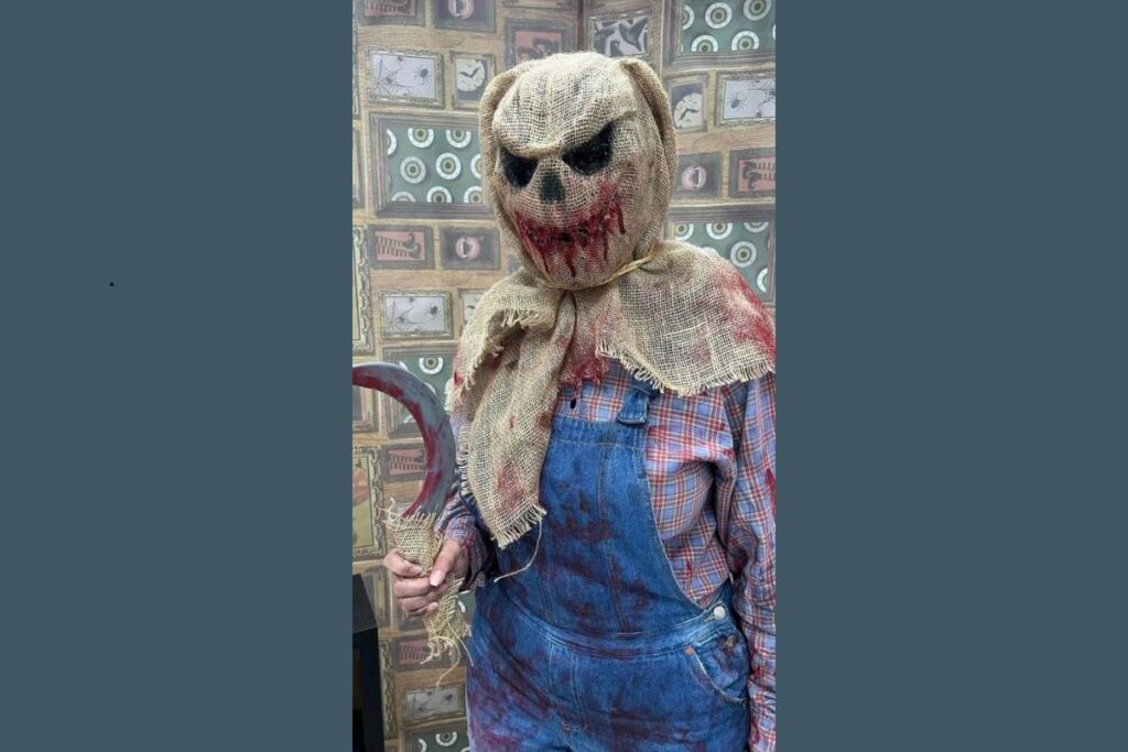 Um visual de arrepiar! Com saco de estopa, roupa suja de sangue e uma foice artesanal, essa fantasia leva o conceito de espantalho a outro nível.