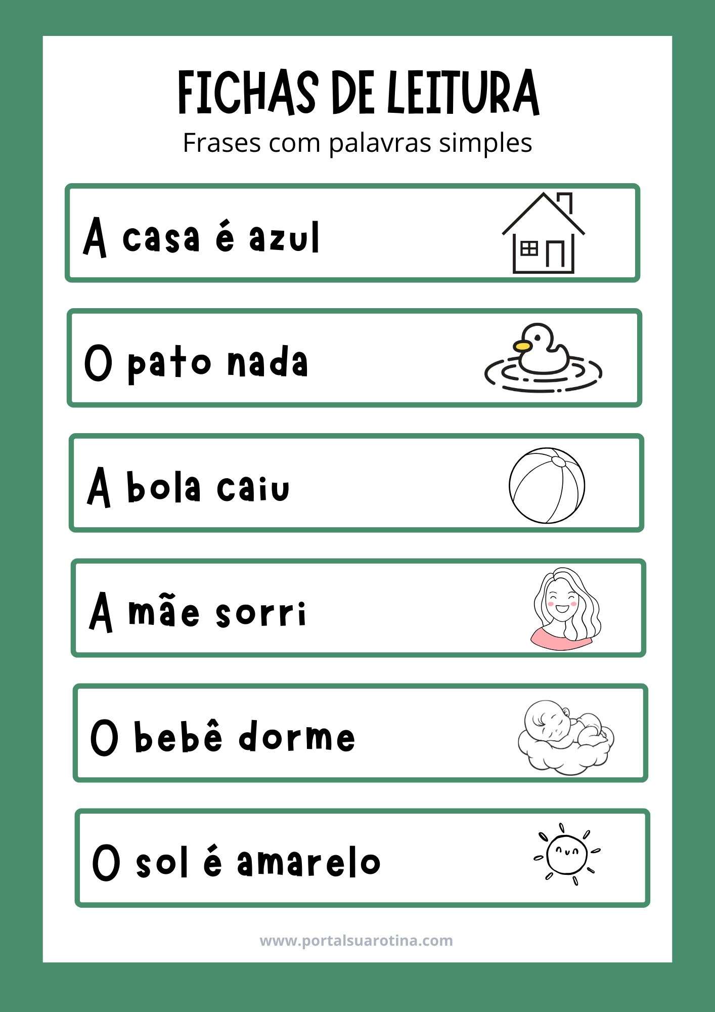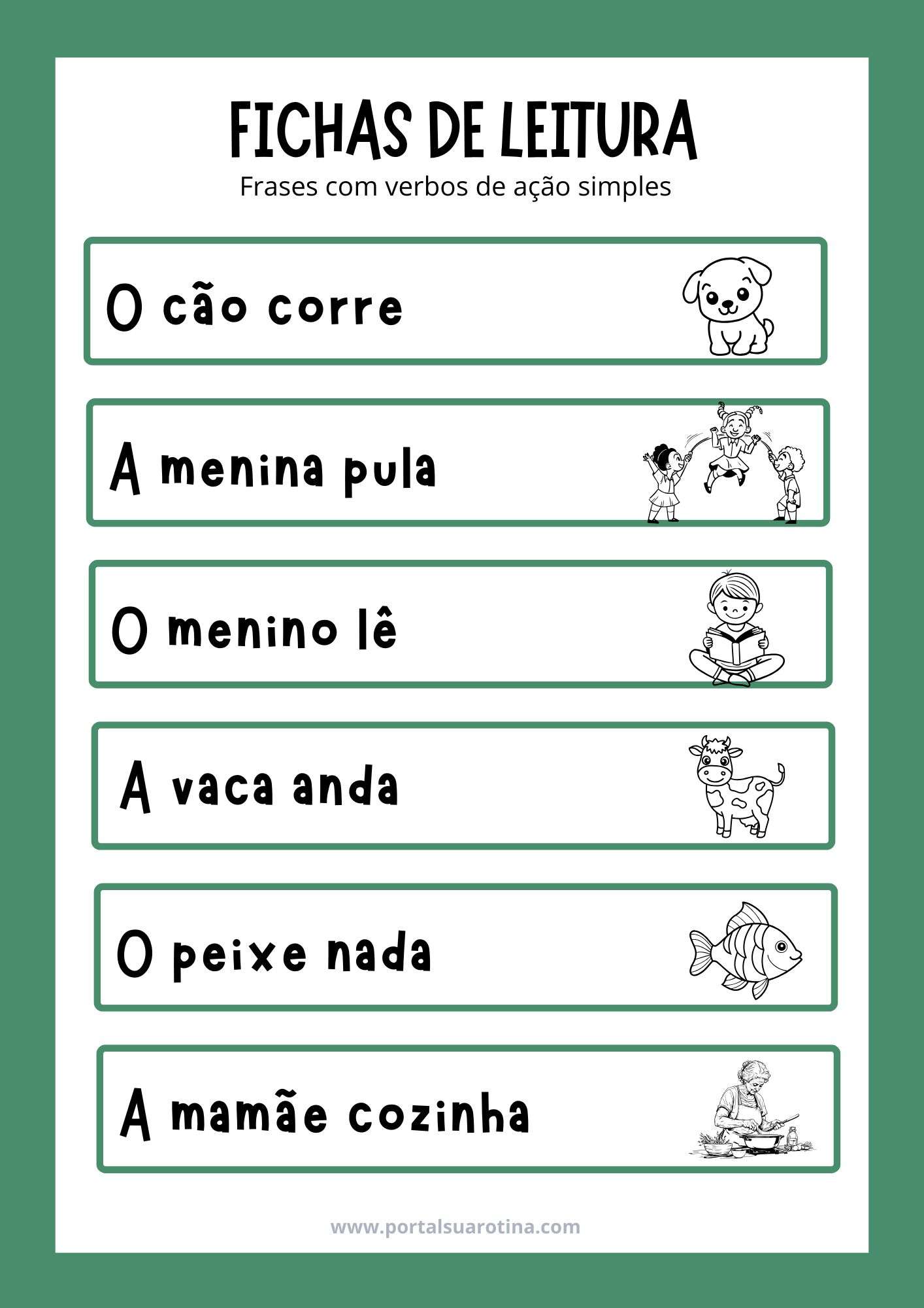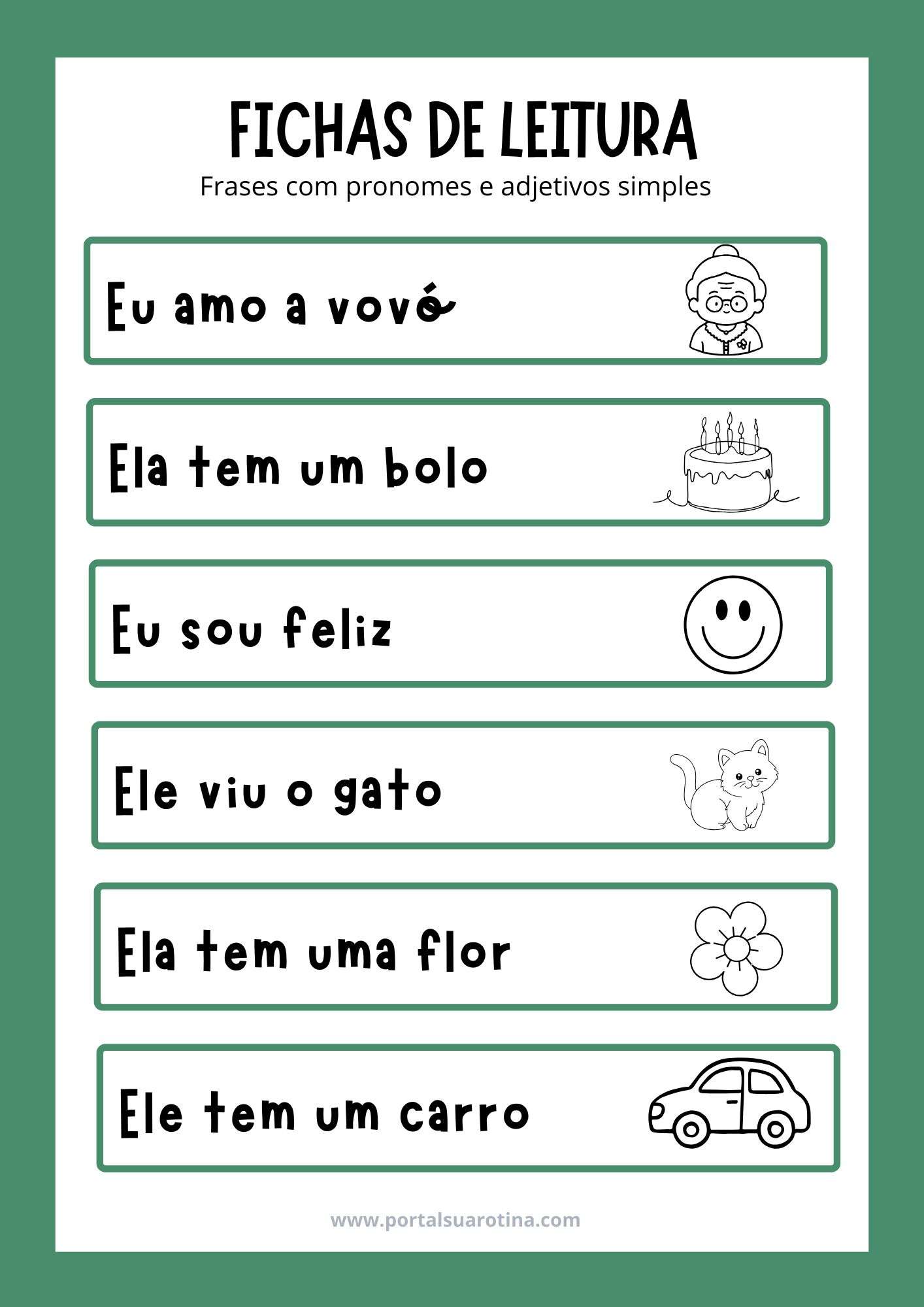 Essas fichas incluem frases simples, desenhos ilustrativos e espaço para colorir, perfeitas para quem está começando a ler.