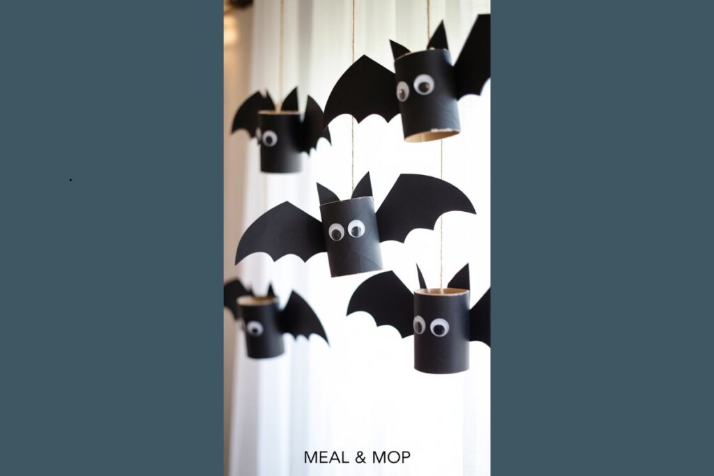 Cada morcego é feito com um rolinho pintado de preto, asas recortadas em cartolina e olhos colantes. Além de ecológica, essa atividade estimula a coordenação motora e a criatividade das crianças.
