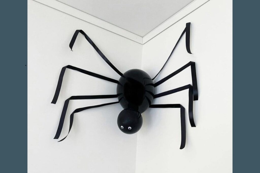 Essa aranha gigante feita com balões é uma das ideias mais simples e impactantes de decoração para o Halloween infantil.