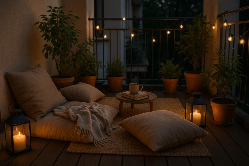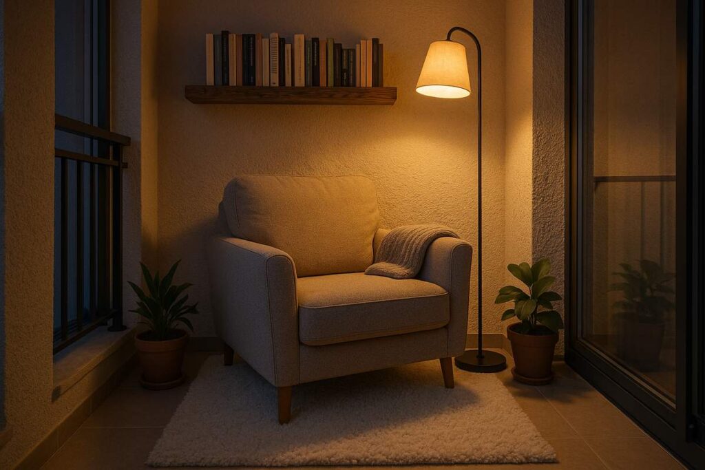 Varanda aconchegante para leitura com luz suave e plantas discretas