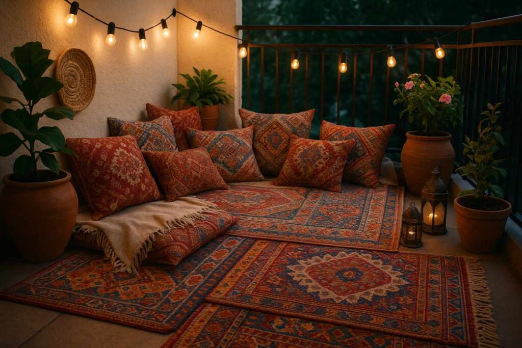 Varanda boêmia aconchegante com tapetes coloridos e almofadas estampadas