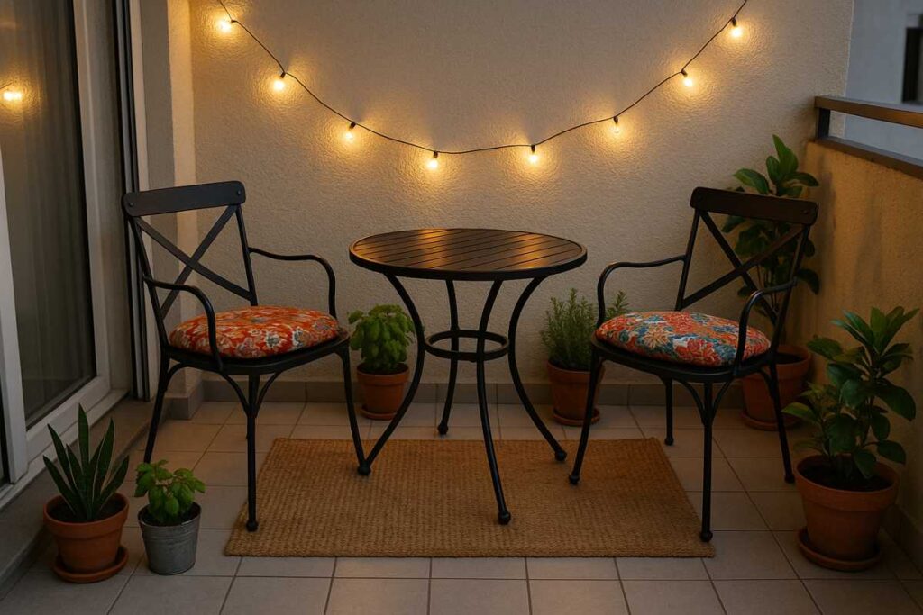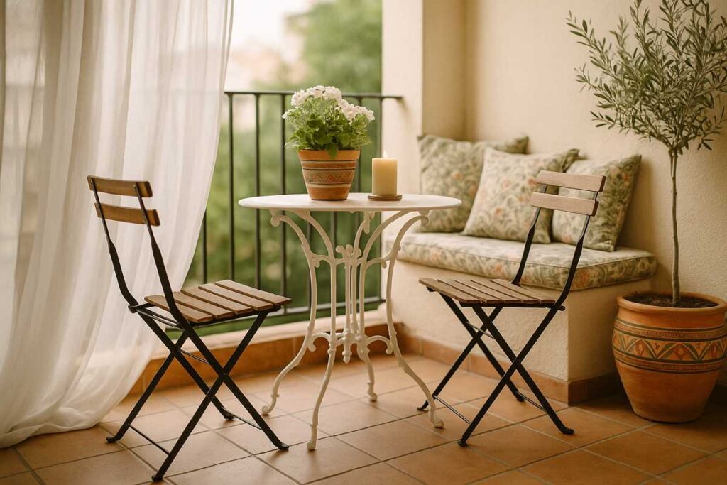 Varanda charmosa com mesa bistrô e detalhes acolhedores