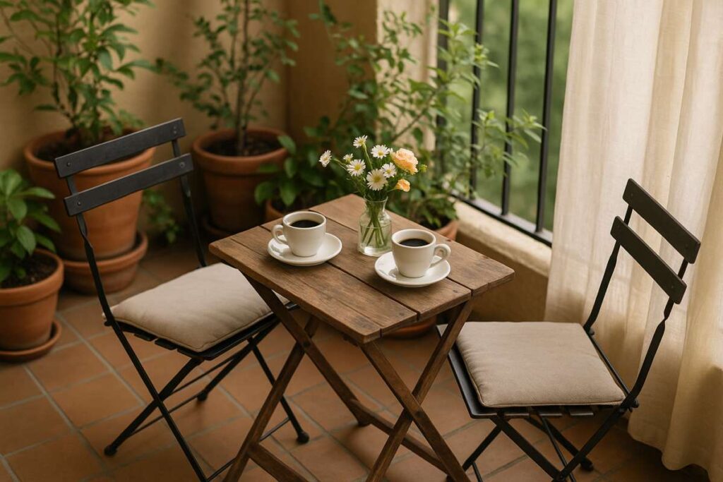 Use uma mesinha pequena, duas cadeiras dobráveis e algumas plantas próximas. É perfeito para começar o dia com tranquilidade.