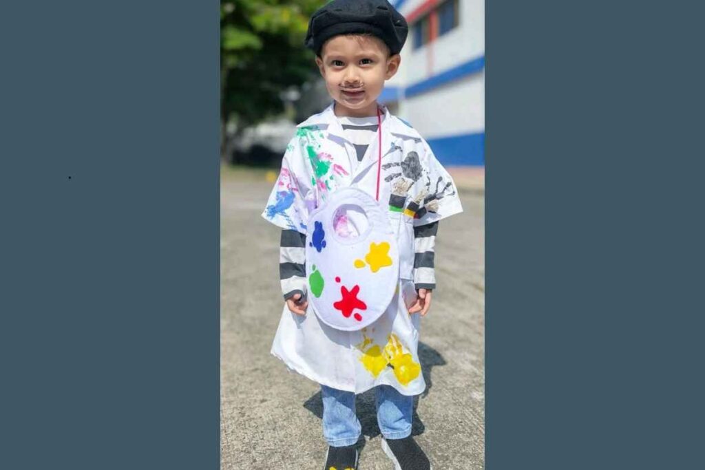 Essa fantasia de carnaval infantil criativa de artista é colorida, divertida e cheia de personalidade.
