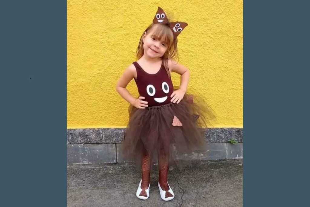 Apesar de inusitada, essa fantasia faz sucesso pelo tom divertido. O uso de tule e cores neutras deixa o visual leve e apropriado para crianças, mostrando que criatividade também pode vir do humor.