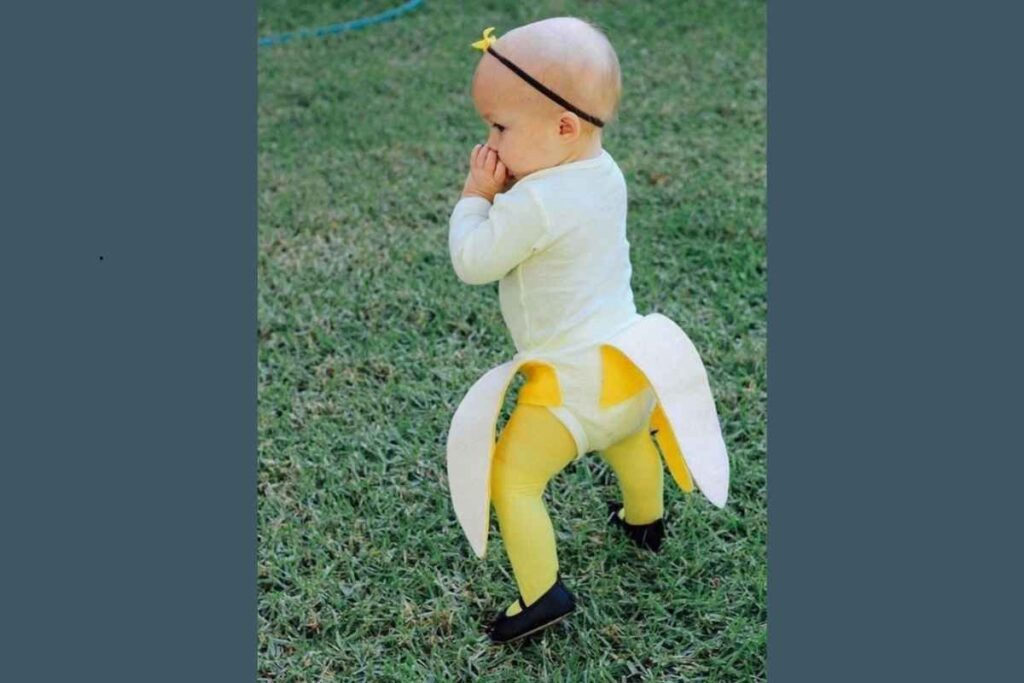 A banana é um clássico reinventado. O uso de tecidos claros e recortes simples cria um visual engraçado e funcional. Essa fantasia funciona bem tanto para bebês quanto para crianças maiores.