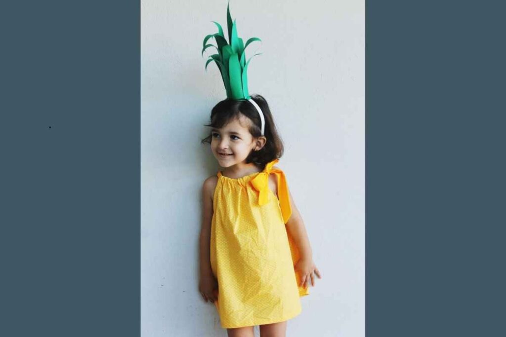 Essa fantasia de carnaval infantil criativa aposta em formas simples e cores marcantes. O vestido amarelo funciona como base neutra, enquanto o adereço verde na cabeça cria o efeito do abacaxi. É leve, confortável e fácil de reproduzir com papel EVA ou feltro.