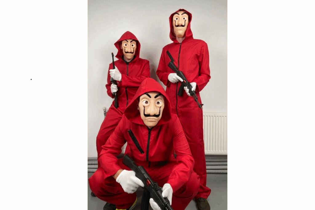 O macacão vermelho e a máscara de Dalí viraram símbolo imediato da série. Além de fácil de encontrar, pode ser usada em grupo, com todos vestidos iguais.