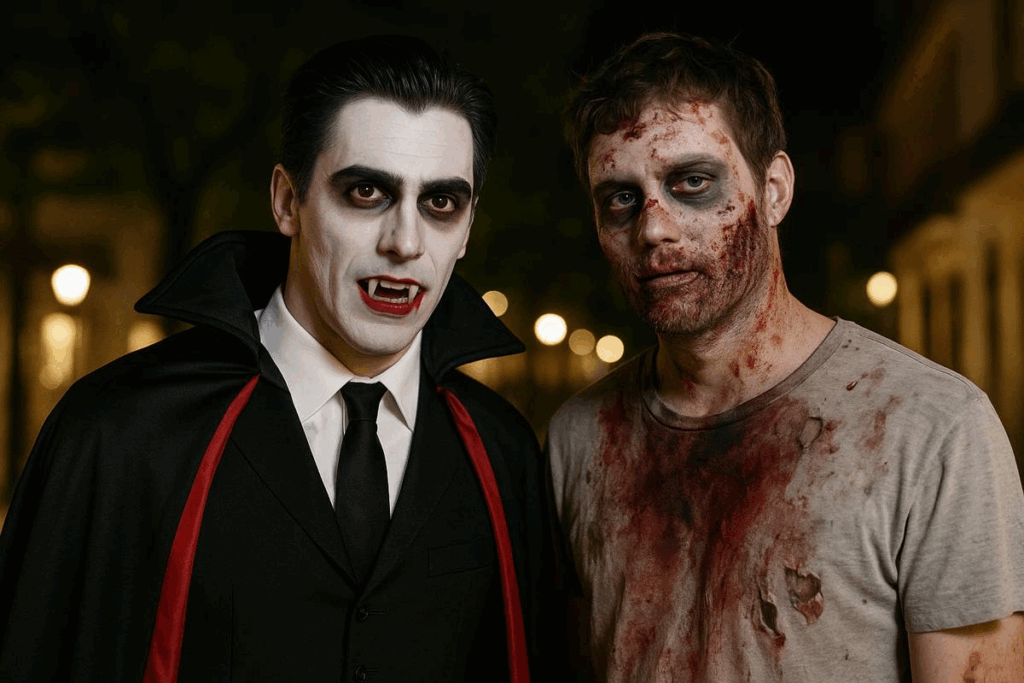Homens fantasiados para o Halloween, um de vampiro e outro de zumbi