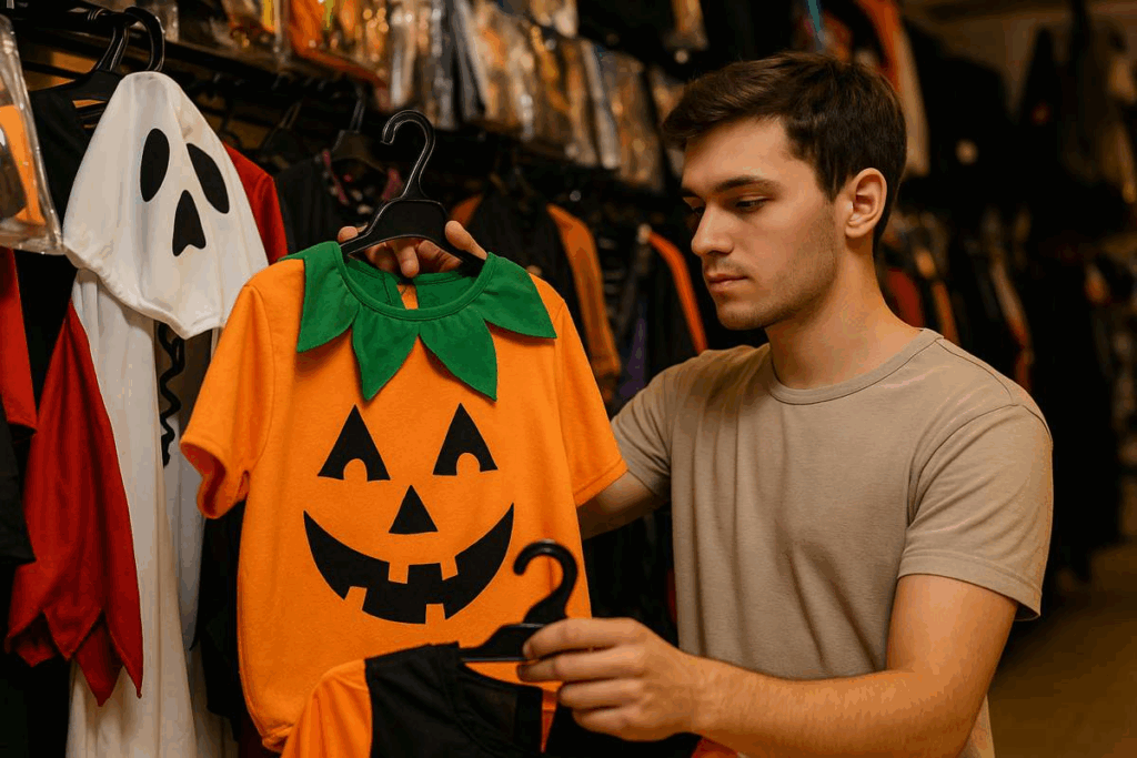 Jovem escolhendo fantasia de Halloween