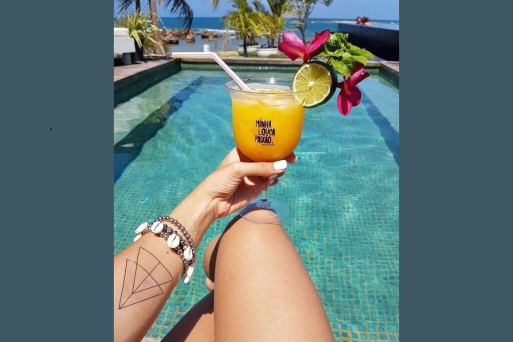 Segurar um drink colorido é uma das ideias de foto na piscina mais populares. O copo vira o ponto de destaque, enquanto a piscina aparece como pano de fundo.