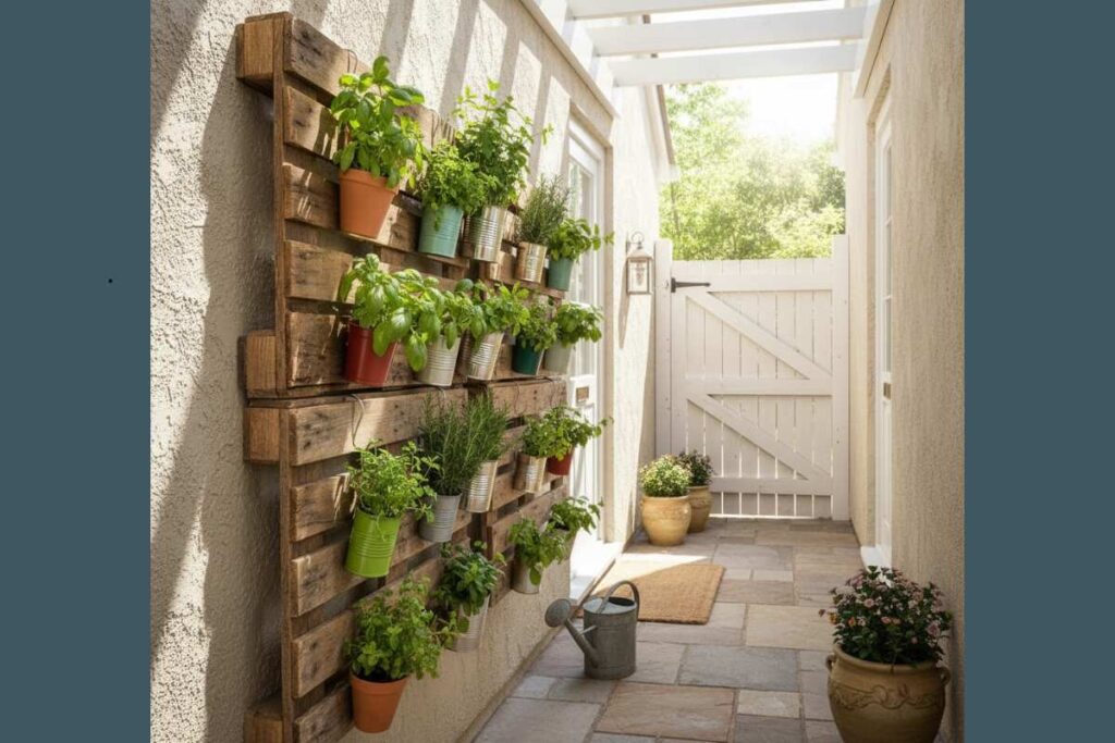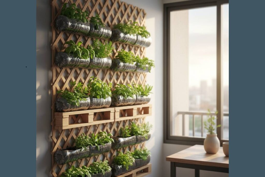 Uma das ideias de hortas mais práticas para apartamentos. Pode ser feita com painéis de madeira, garrafas PET cortadas ou pallets. O formato vertical otimiza o espaço e cria um visual moderno.