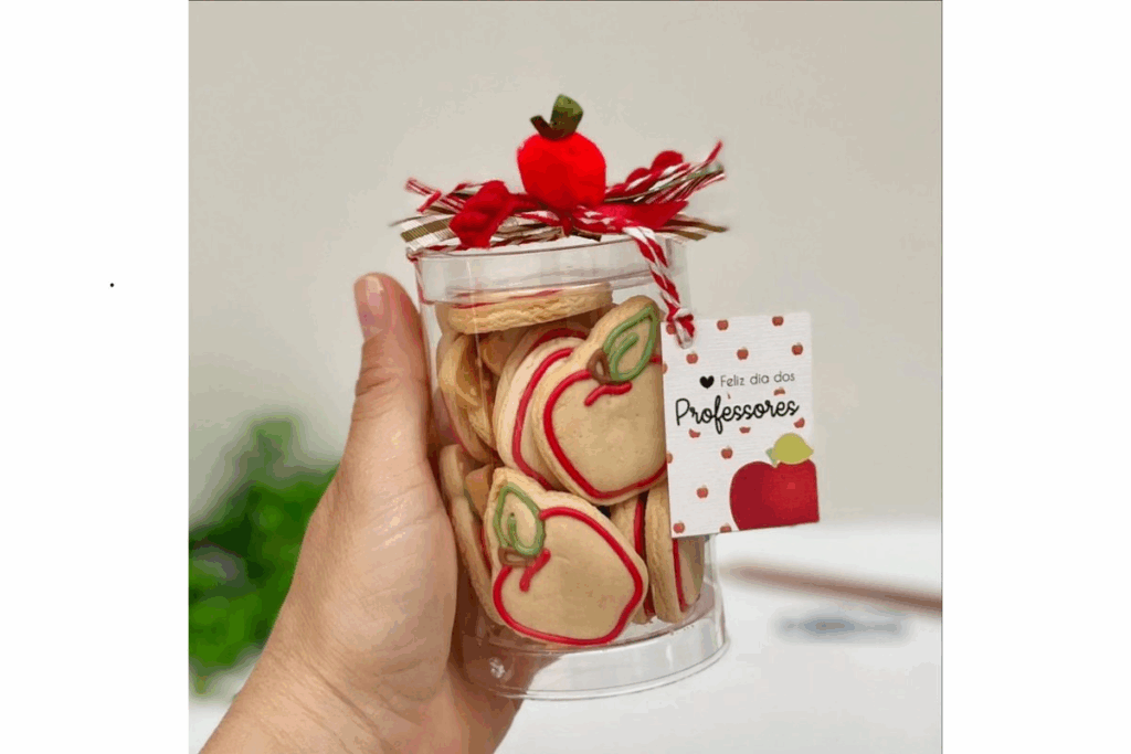 Os biscoitos decorados são um presente encantador, principalmente quando ganham formatos relacionados à profissão: maçãs, lápis, cadernos ou corações.