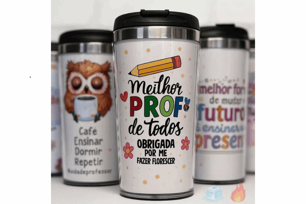 O copo térmico é uma das opções mais populares entre professores. Ideal para manter o café ou chá quentinho durante o dia, ele combina funcionalidade com afeto.