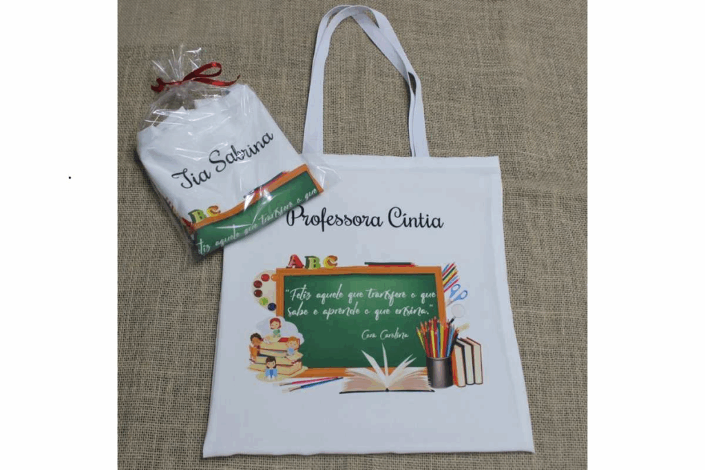 Uma bolsa personalizada é uma lembrança prática e elegante. Professores carregam muitos materiais, como cadernos, provas, livros e até lanches, e ter uma sacola com o próprio nome é uma forma carinhosa de facilitar o dia a dia.