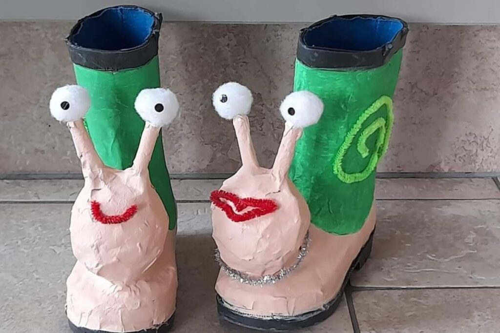 Uma das ideias mais originais é essa bota transformada em caracol. Os olhos grandes em destaque e a pintura verde criam um efeito único e inesperado. É um sapato maluco que mistura humor e imaginação.