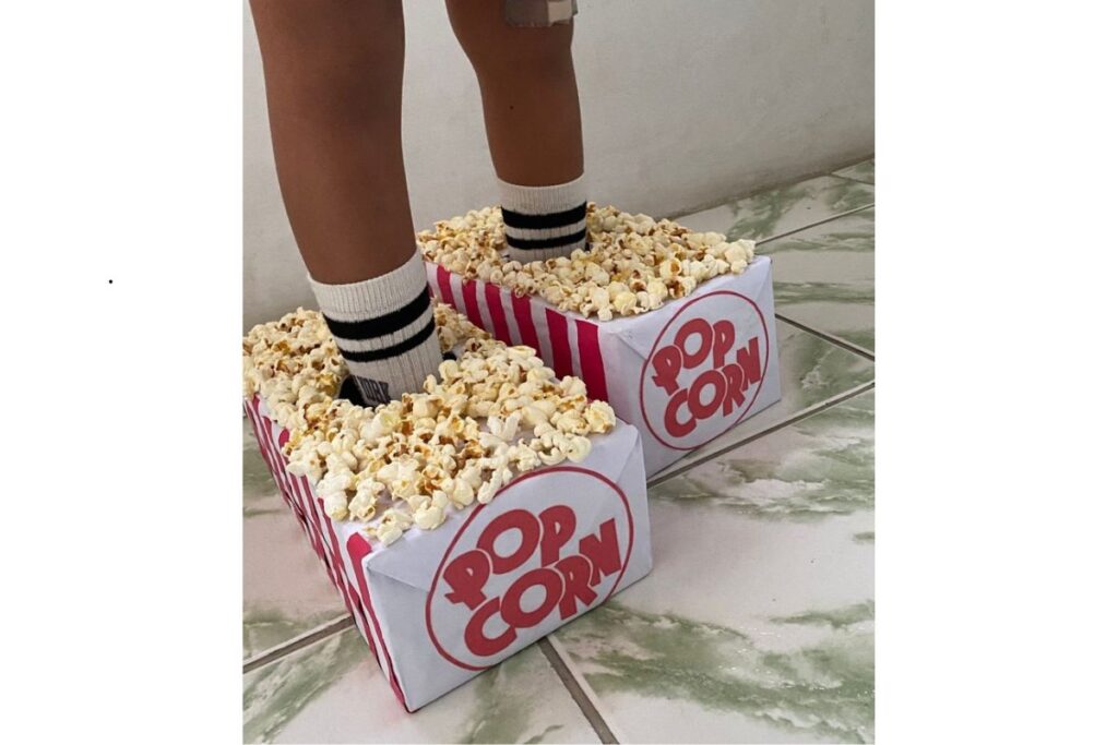 Aqui o destaque vai para a inspiração no cinema. O sapato foi coberto com caixas decoradas de pipoca, trazendo grãos espalhados por cima e criando uma ilusão super realista.