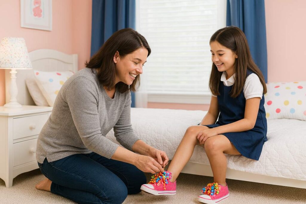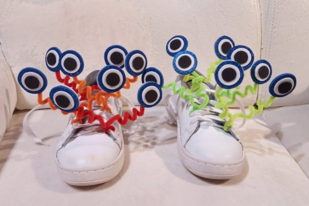 Adicionar laços, pompons, fitas adesivas coloridas ou até desenhos feitos com tinta para tecido é uma forma prática e barata de transformar sapatos comuns em versões divertidas e criativas.