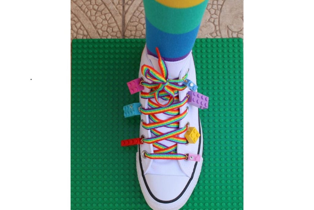 As peças de lego coloridas são fixadas nos cadarços, junto com cadarços de arco-íris que deixam o visual ainda mais divertido. É uma ótima ideia para quem gosta de brincar com cores e montar algo diferente.
