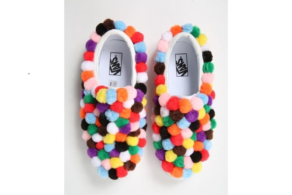 Esse modelo traz pompons de lã em diversas cores colados no sapato branco, transformando completamente o calçado em uma peça divertida e vibrante. É uma forma simples, mas muito criativa, de personalização.