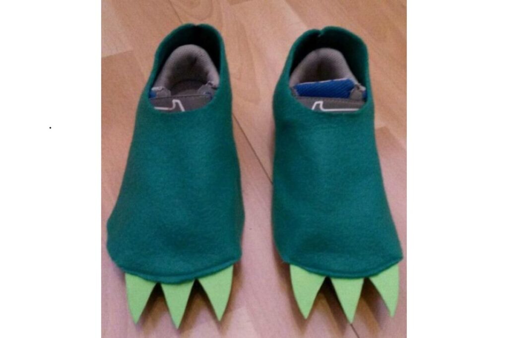 Neste exemplo, os sapatos foram cobertos por feltro verde com pontas em formato de garras, lembrando os pés de um dinossauro. É uma escolha criativa para quem gosta de brincar com temas de animais e pré-história.