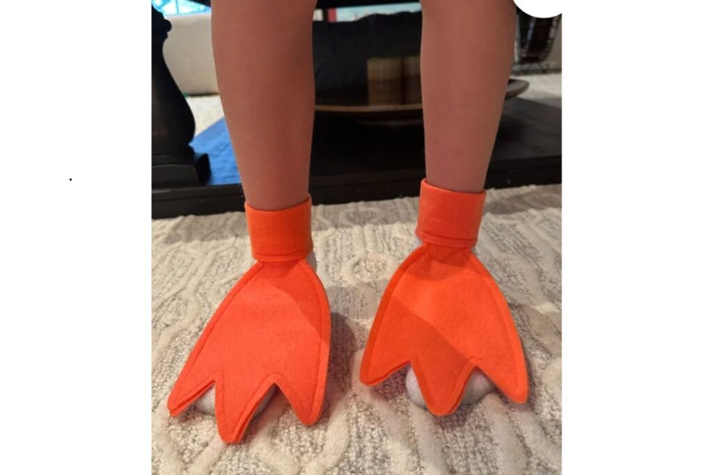 Esse modelo traz um ar engraçado e caricato, com sapatos transformados em pés de pato laranja.