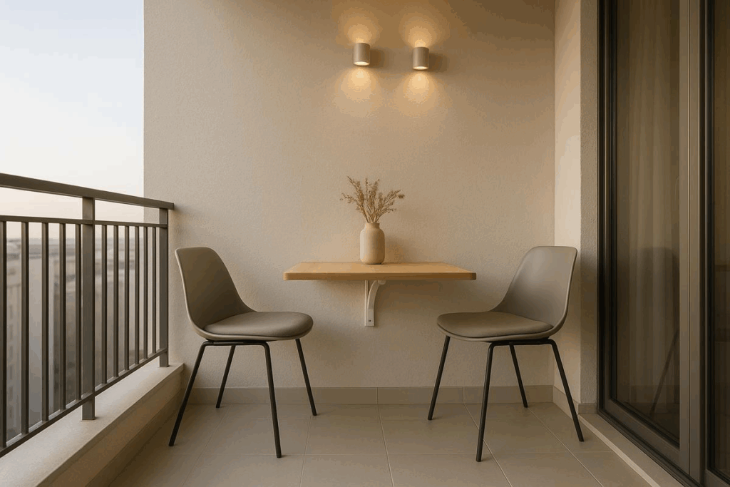 Mesas e cadeiras são indispensáveis para quem costuma receber visitas. Em varandas pequenas, os modelos dobráveis são ideais, pois otimizam o espaço e podem ser guardados quando não estiverem em uso.