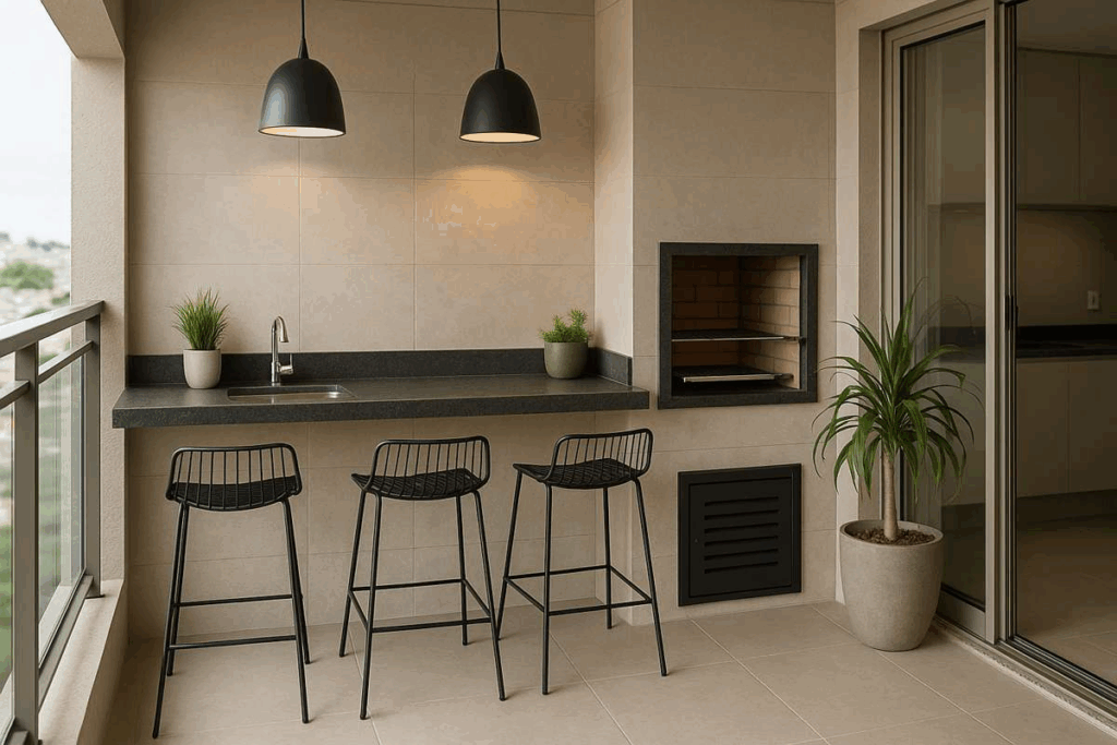 É um visual marcante que transmite modernidade e atitude, especialmente em varandas maiores ou integradas a áreas gourmet.