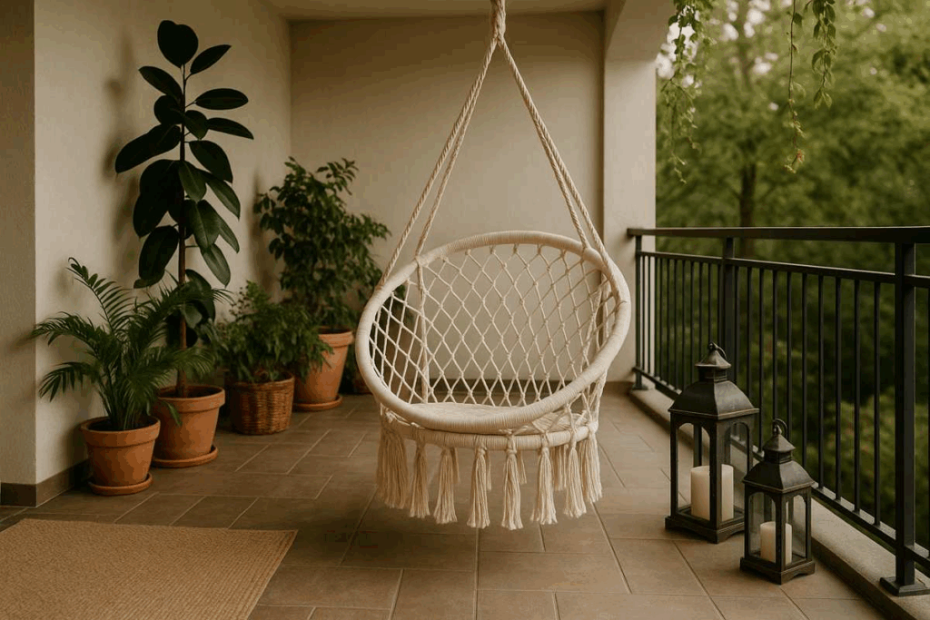Para encontros mais intimistas, a rede ou cadeira suspensa trazem charme e conforto. Plantas e lanternas completam a atmosfera.
