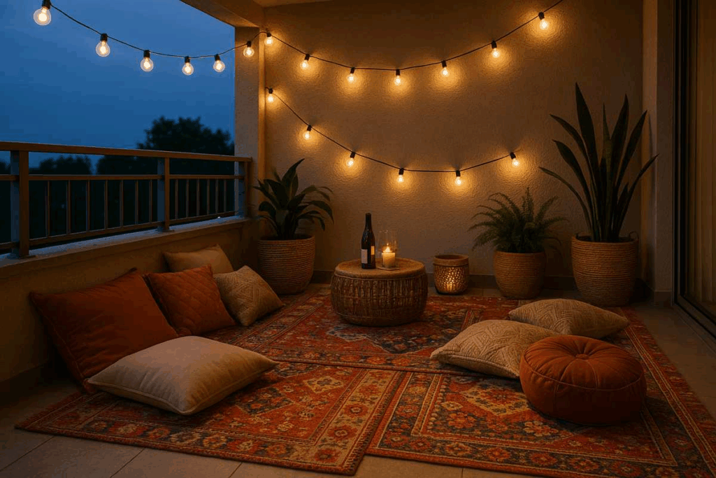 2. Varanda boho com almofadas e luzes de corda