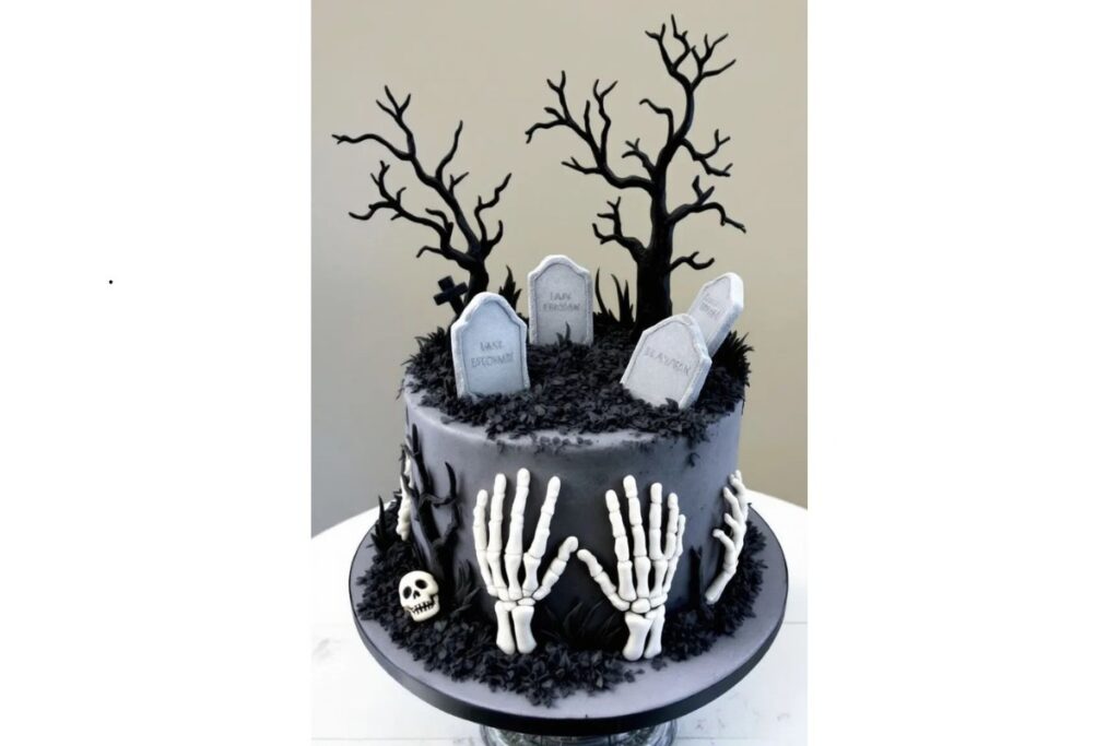 Essa versão é perfeita para quem busca um visual mais sombrio. A decoração traz árvores secas, lápides e mãos esqueléticas saindo do bolo, criando um clima de “terror cinematográfico”.