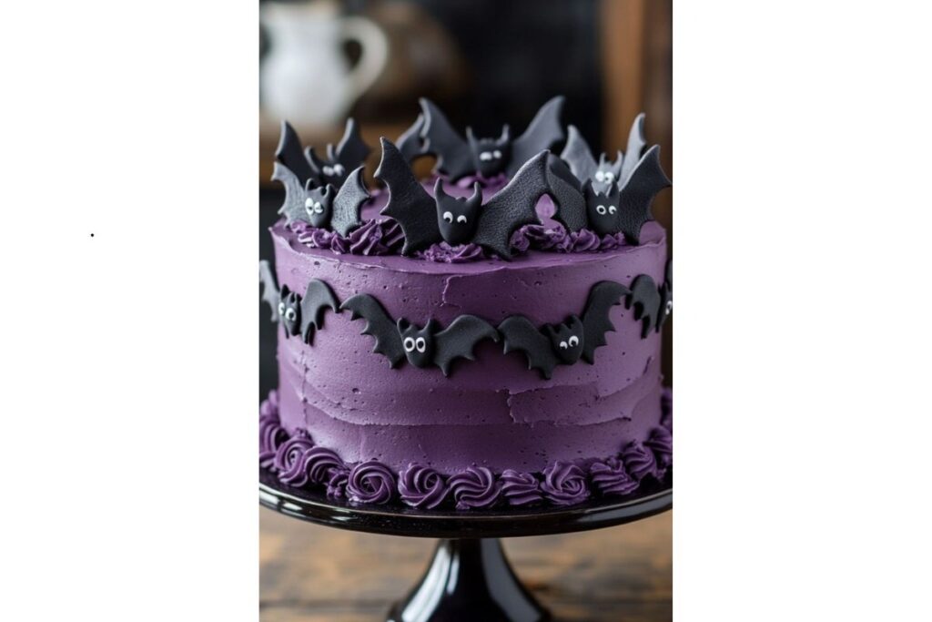 O bolo de Halloween com morcegos é divertido e moderno. Feito com cobertura roxa e pequenos morcegos de pasta americana, ele chama atenção pela estética equilibrada entre o fofo e o assustador.