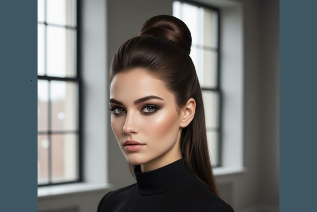 Clássico e atemporal, o coque alto combina com roupas elegantes e maquiagem mais marcada. O segredo está em garantir que os fios fiquem bem esticados e o acabamento impecável.