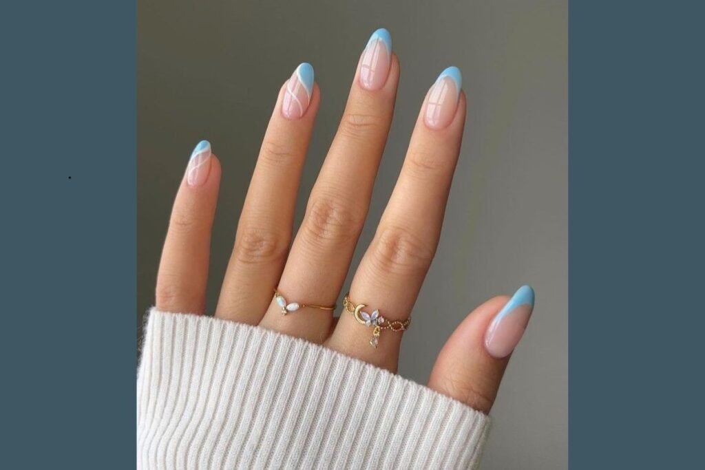 A última inspiração traz uma releitura da francesinha tradicional. Em vez do clássico branco, as pontas recebem um toque de azul bebê com linhas onduladas que acompanham o formato natural da unha.