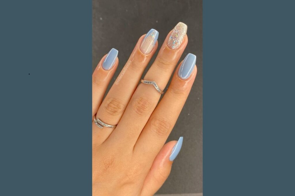 Essa opção aposta em um mix de azul bebê e transparência, com detalhes de glitter que iluminam o visual. O destaque fica no dedo anelar, que traz um toque espelhado e delicado.
