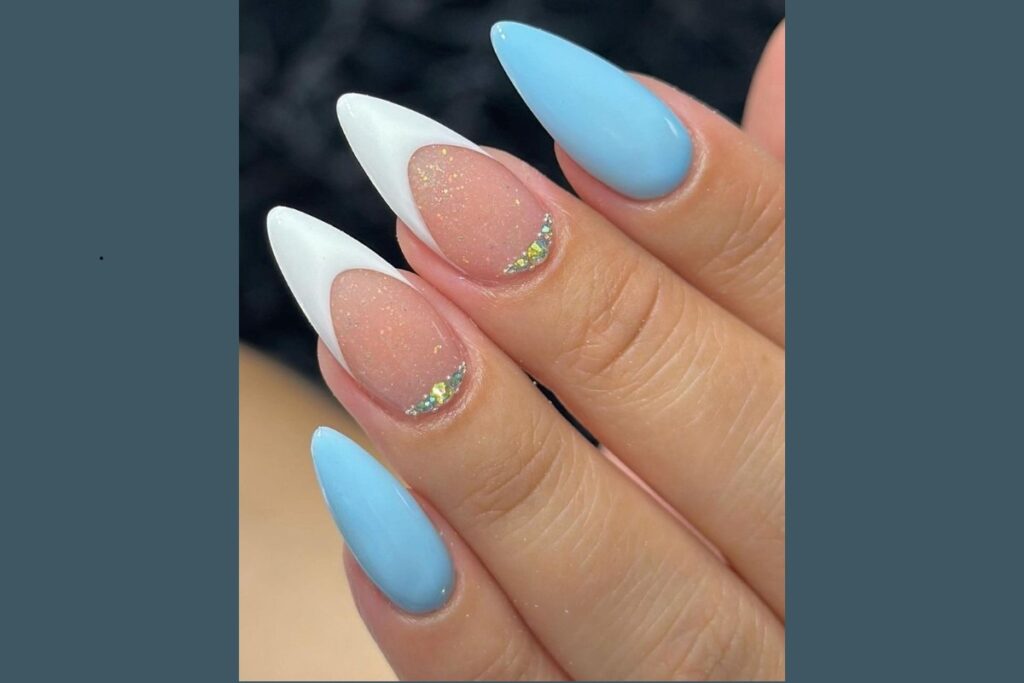 A terceira inspiração mistura o azul bebê com o branco em um formato pontudo e criativo. As unhas alternam tons e adicionam glitter sutil nas transições, resultando em um visual contemporâneo e sofisticado.