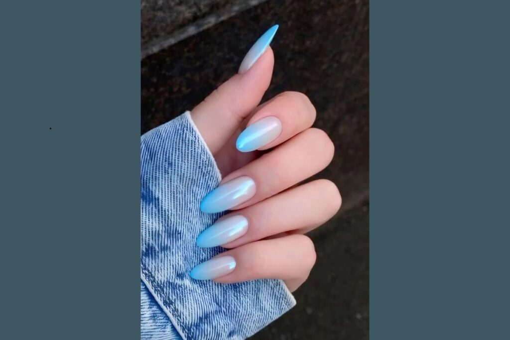 O estilo cromado, com leve transição de cor, traz um visual futurista e refinado. As unhas começam com uma base translúcida e ganham um brilho perolado que se intensifica nas pontas, criando um degradê em tons de azul.