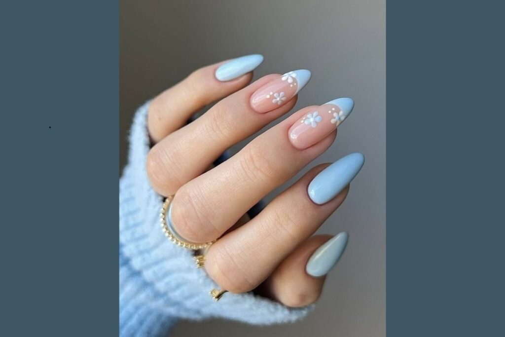 O design floral é uma das maiores apostas entre as Unhas Azul Bebê 2026. Nessa inspiração, as flores brancas delicadas aparecem sobre uma base nude, intercalando unhas totalmente azuis com outras decoradas.