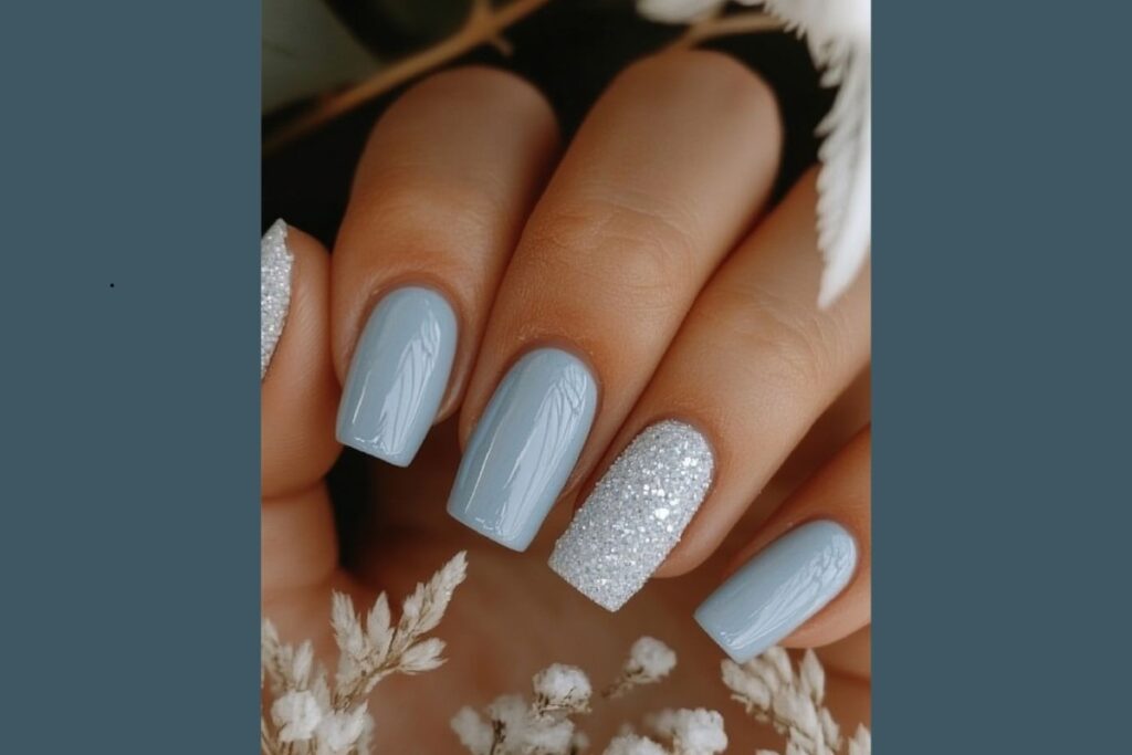 Aqui, as Unhas Azul Bebê 2026 ganham brilho com um toque de glitter. O contraste entre o acabamento cremoso e o dedo anelar coberto de partículas prateadas cria um equilíbrio entre sutileza e glamour.