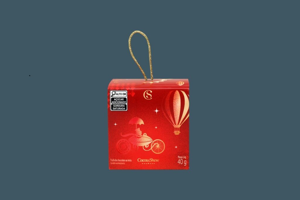 O cubo traz três mini-trufas de 13,5 g cada, com textura cremosa e sabor marcante. Além disso, conta com um elástico que permite pendurá-lo na árvore de Natal, incorporando o chocolate à decoração da casa.