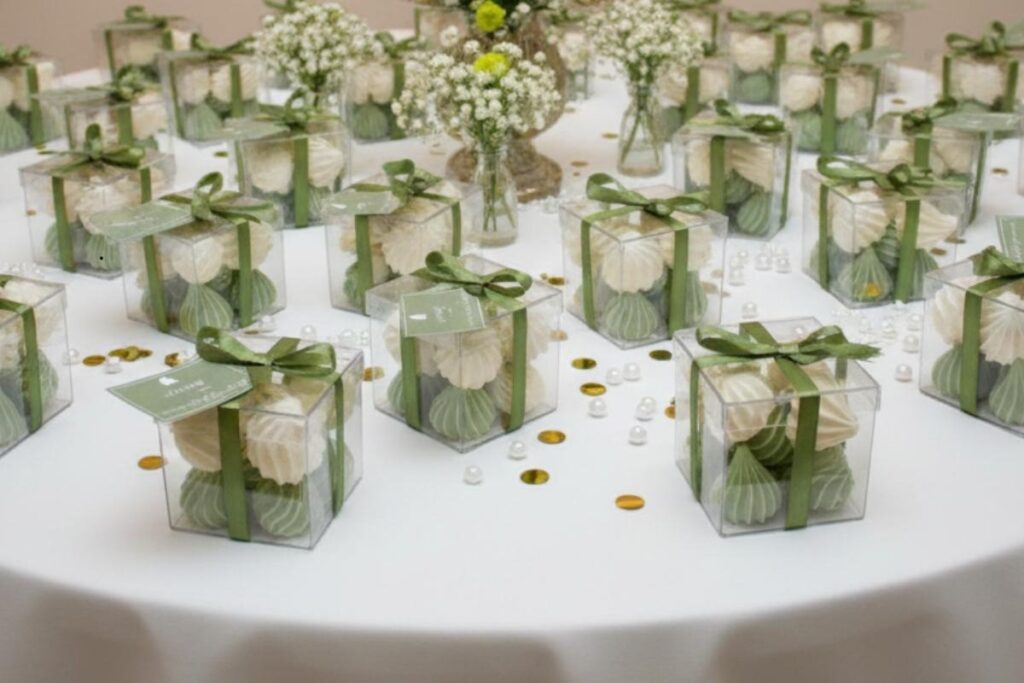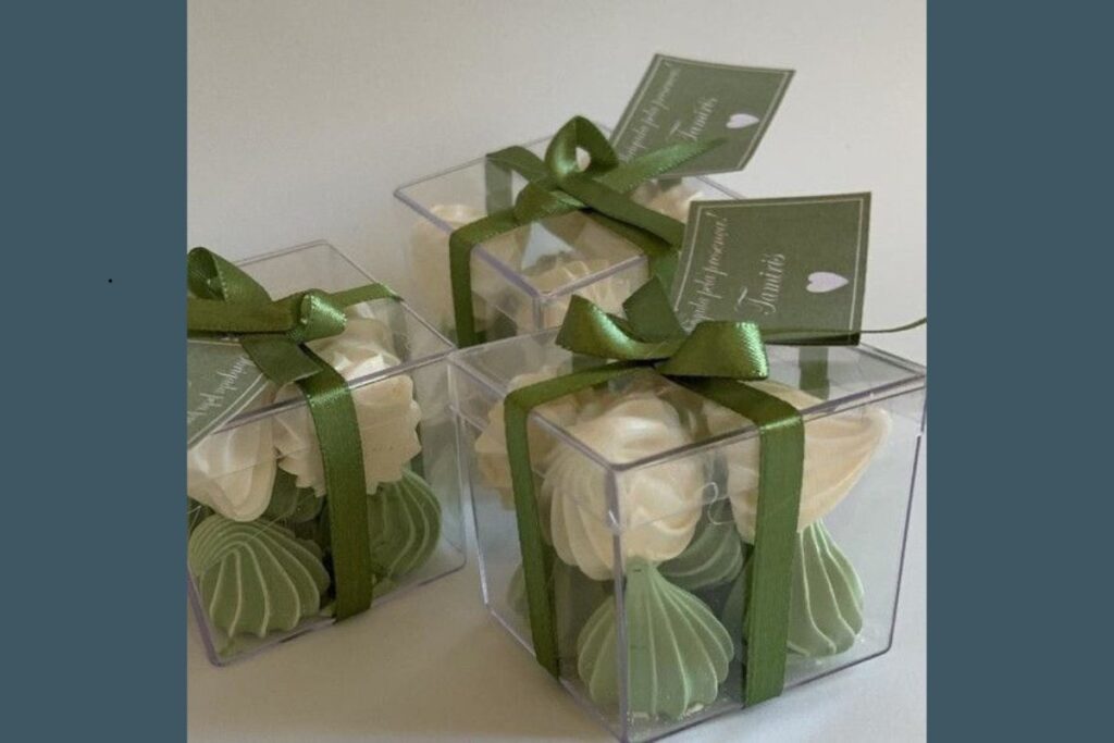 Os suspiros são ótimos para quem busca lembrancinhas econômicas e saborosas. Embalados em caixinhas transparentes e decorados com fita de cetim, eles ganham um visual elegante e festivo.