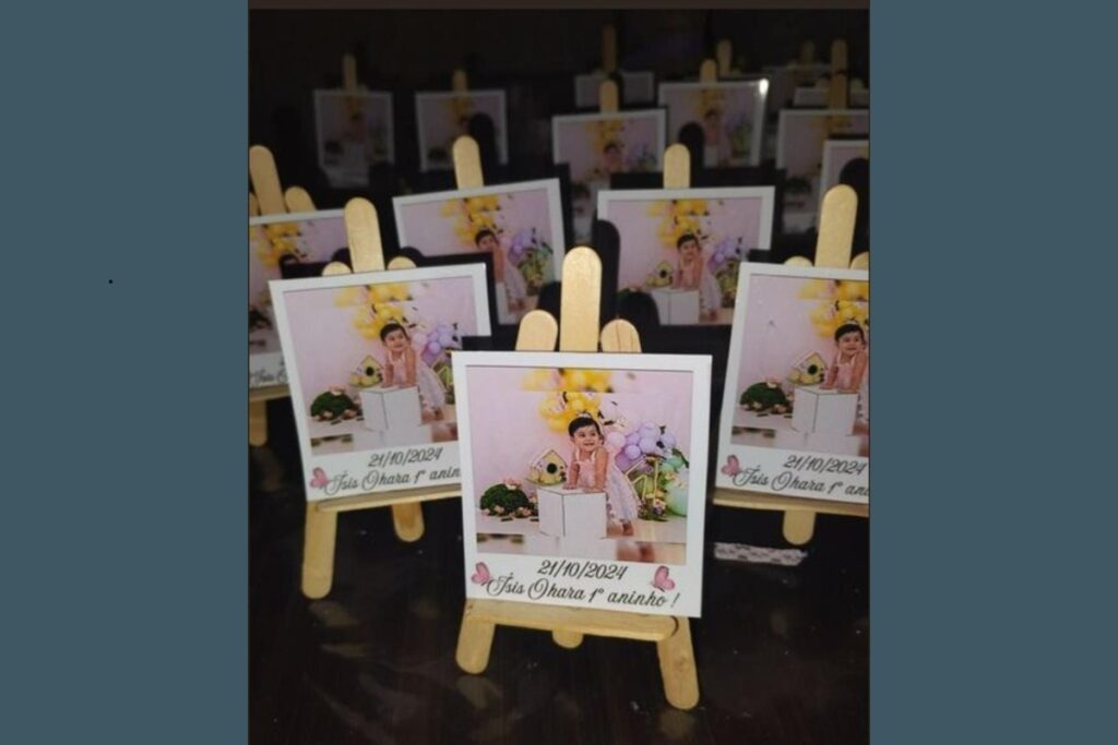 O mini quadro com cavalete traz um ar artístico e charmoso à lembrancinha. A foto do aniversariante vira uma mini obra de arte, e o cavalete de madeira dá estabilidade e personalidade à peça.