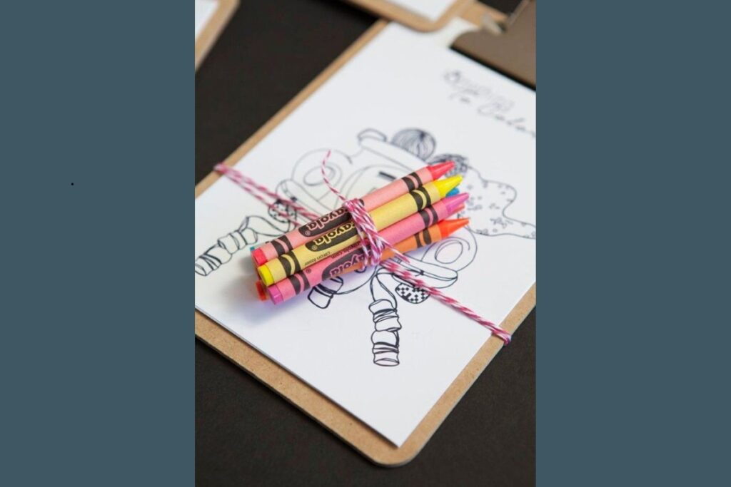 Esse kit é uma das lembrancinhas de aniversário baratas mais práticas e versáteis. Consiste em um desenho para colorir acompanhado de giz de cera coloridos, tudo preso com um barbante simples.