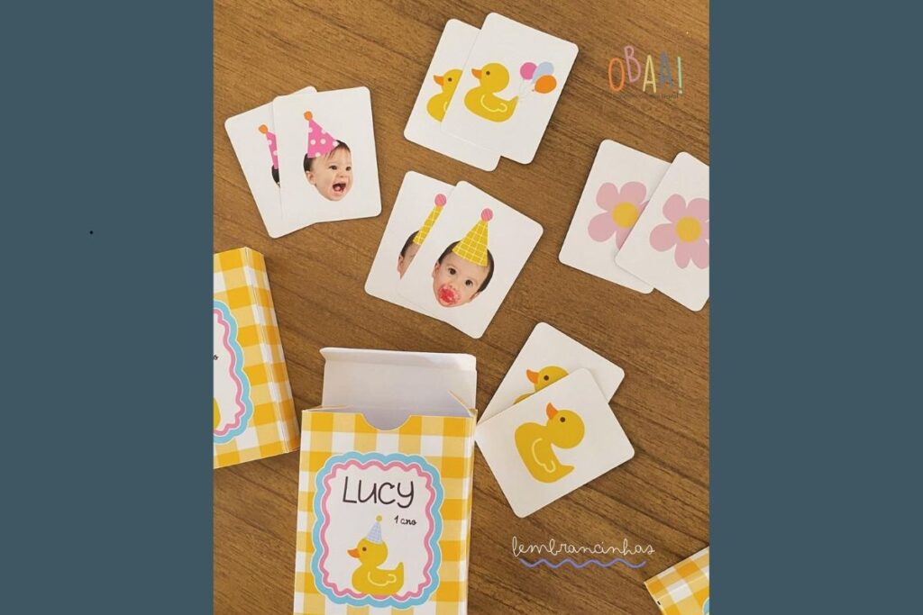O jogo da memória é uma lembrancinha criativa e funcional. Na imagem, as peças incluem fotos da criança com chapéu de festa e desenhos temáticos como patinhos e flores.