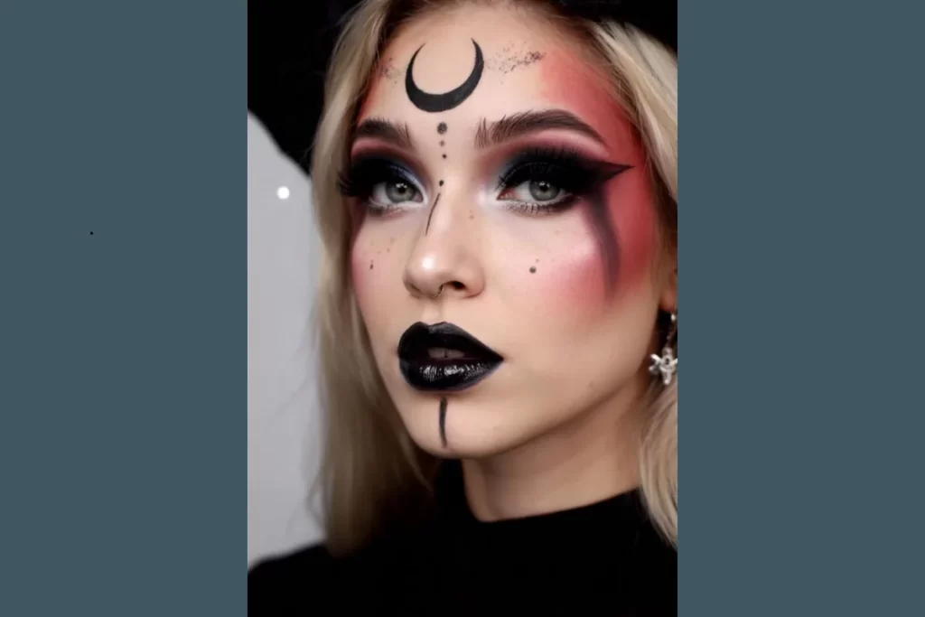 Os olhos esfumados e o batom preto criam uma atmosfera misteriosa, ideal para fantasias com temática mística ou ocultista no Carnaval.